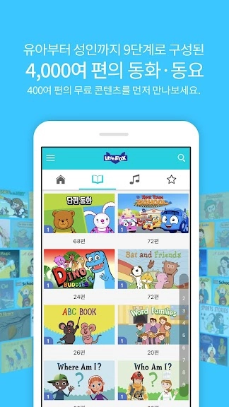 * 영어 동화 4,000여 편 모두 볼 수 있습니다. 80여 개의 시리즈 동화와 670여 편의 단편으로 구성된 풍부한 스토리의 동화로 폭넓은 학습을 할 수 있습니다. 생활영어, 세계명작, 전래동화, 판타지, 미스터리, 동물, 과학, 인물, 여행, 우정, 학교 등의 폭넓은 주제로, 픽션과 논픽션이 잘 조화되어 어린이들의 지성과 감성 발달에 유익합니다.