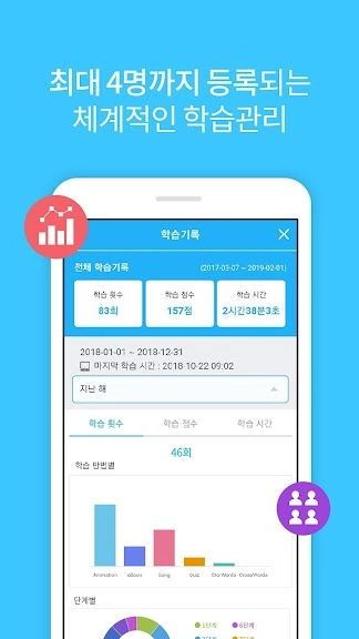 * ID에 사용자를 3명까지 추가할 수 있으며, 사용자 별로 학습기록에서 자녀들이 매일 어떤 동화를 얼마나 보았는지, 어떤 퀴즈를 풀었는지 알 수 있고, 책장 담기 기능도 추가 사용자별로 각각 제공 됩니다. (웹사이트 연동)